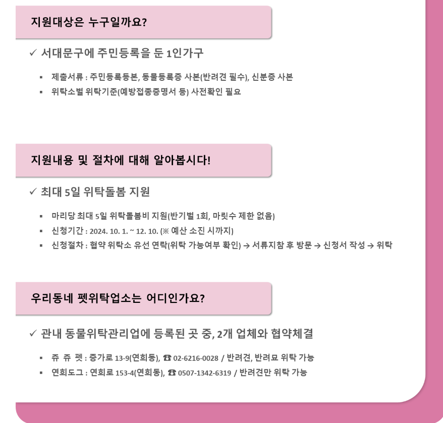 서대문구에서는 1인 가구의 반려동물 돌봄 부담을 덜어드리기 위해 최대 5일간의 위탁 돌봄을 지원하는 사업을 진행하고 있습니다.