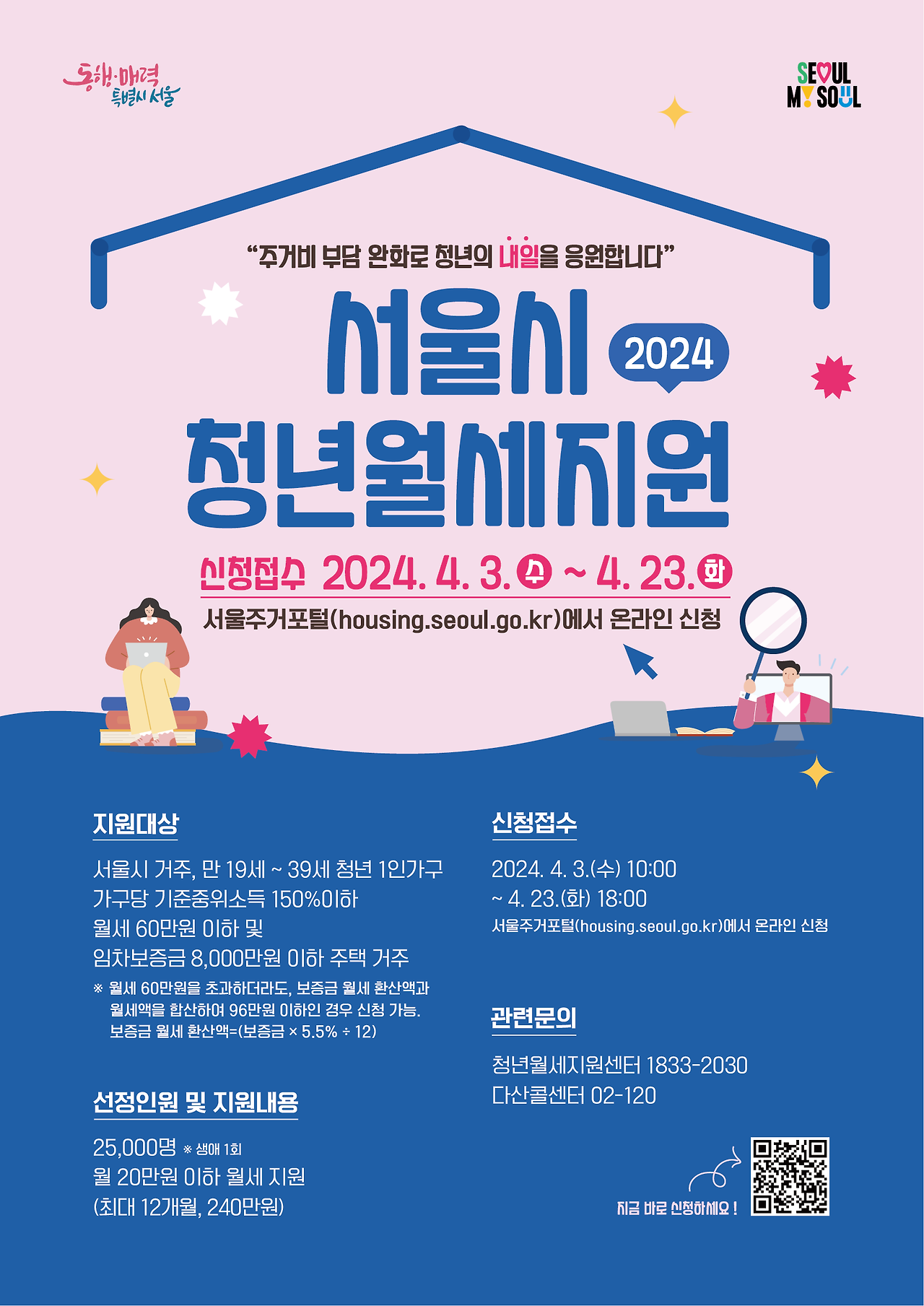 | 2024 서울시 '청년월세지원' 월 20만원 최대 12개월 지원 기간 신청방법 알아보기 (0) | 2024.04.17 |