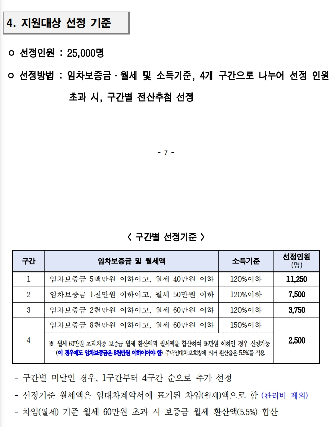 선정방법 : 임차보증금ㆍ월세 및 소득기준 4개 구간으로 나누어 선정하고