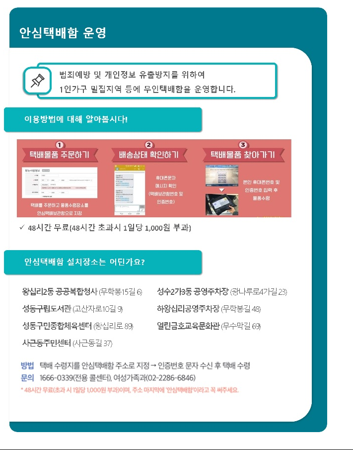 - 예시: 서울특별시 성동구 무학봉15길 6 (왕십리2동 공공복합청사) 안심택배함
