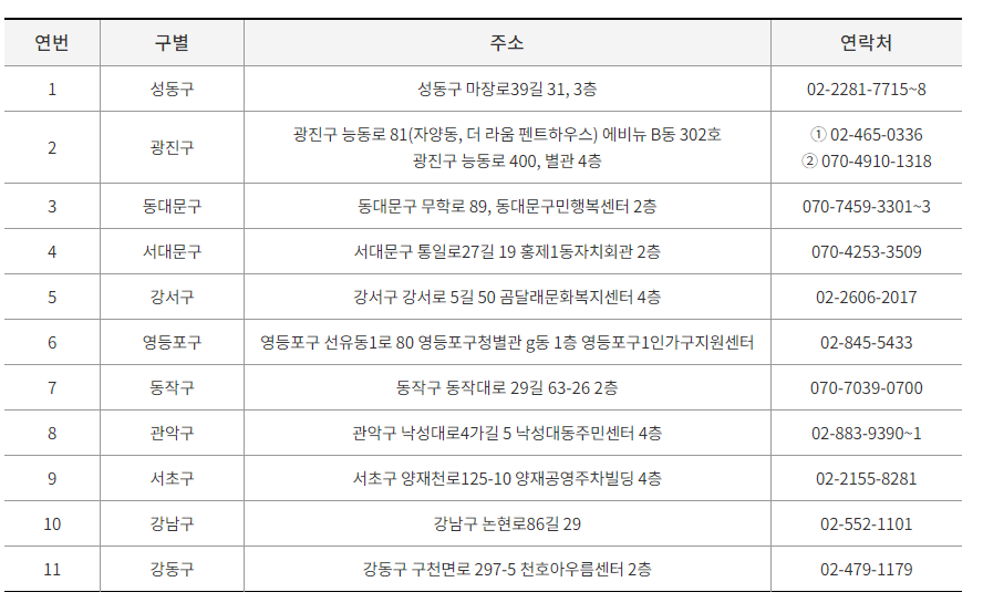 ☞ 성동구, 동대문구, 서대문구, 강서구, 관악구, 광진구(중장년), 강남구(청년)
