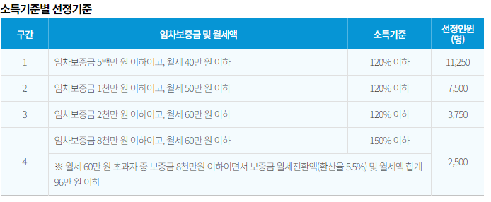 시는 실질적으로 주거비 부담을 크게 느끼는 저소득 청년의 어려움을 덜어주기 위해 임차보증금과 월세가 낮은 구간(보증금 1천만 원 이하, 월세 50만 원 이하)에 많은 인원을 배정(75%, 18,750명)하여 지원할 예정이다.